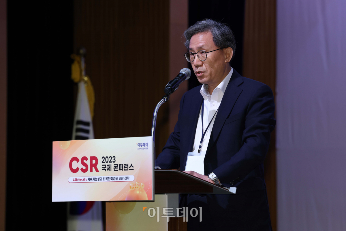 김덕헌 이투데이 대표이사가 17일 서울 중구 대한상공회의소에서 열린 ‘2023 CSR 국제 콘퍼런스’에서 인사말을 하고 있다. ‘CSR for All:지속가능성과 회복탄력성을 위한 전략’을 주제로 열린 이번 콘퍼런스는 미래 CSR활동의 올바른 방향 설정에 대한 전문가들의 의견을 공유하고 지속가능한 사회 실현에 대해 논의하는 자리다.