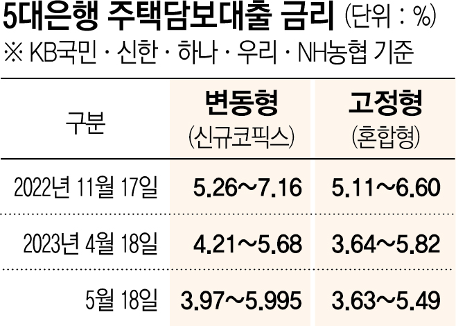 18일 금융권에 따르면 5대 시중은행(KB국민·신한·하나·우리·NH농협)의 신규 코픽스 기준 변동형 주담대 금리는 연 3.97~5.995%다. 변동형 금리 하단이 3%대로 내려온 것은 지난해 7월(3.92%) 이후 10개월 만이다.