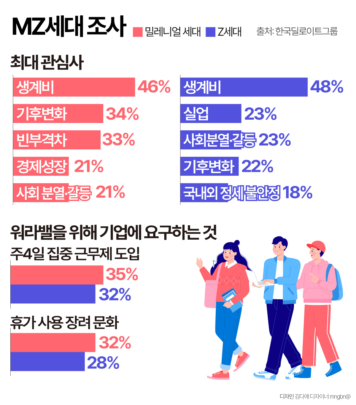 최대 관심사로 밀레니얼 세대 46%, Z세대 48%가 모두 생계비를 꼽았다. 밀레니얼 세대는 이어 기후변화(34%), 빈부격차(33%), 경제성장(21%), 사회 분열·갈등(21%) 순으로 나타났다. Z세대는 실업(23%), 사회 분열·갈등(23%), 기후변화(22%), 국내외 정세 불안정 순으로 관심사를 나타냈다.