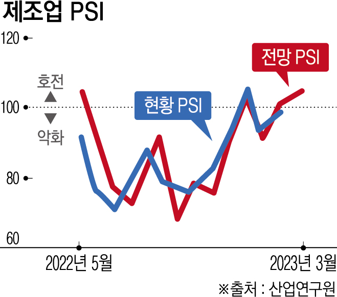 21일 산업연구원이 발표한 산업경기 전문가 서베이 조사 결과 지수(PSIㆍ5월 현황과 6월 전망)에 따르면 6월 제조업 업황은 104로 이번 달보다 개선할 전망이다. 100을 기준으로 낮을 수로 악화 높을수록 호전을 의미한다.
