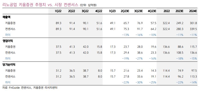 박 연구원은 “리노공업은 경기 침체 우려 확대와 주요 고객들의 재고조정 영향으로 단기적인 실적 부진을 겪고 있다”면서도 “올해 1분기 실적 쇼크에도 불구하고 실적 컨센서스가 여전히 높게 형성되어 있는 점을 감안하면, 시장 참여자들이 이러한 업황의 흐름을 크게 간과하고 있는 것으로 보인다”고 했다.