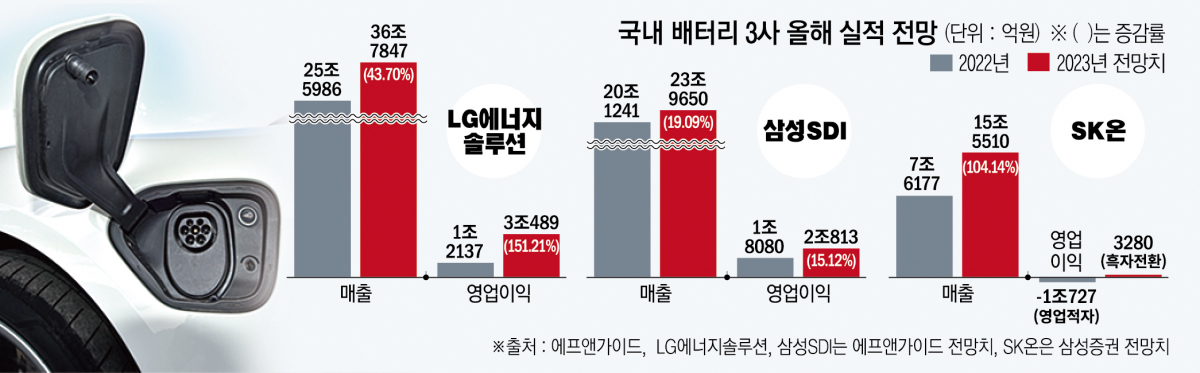 전기차 시장의 성장과 미국 인플레이션 감축법(IRA) 수혜에 힘입어 올해 국내 배터리 3사의 영업이익 합계가 5조 원 이상으로 사상 최대치를 기록할 것으로 보인다.