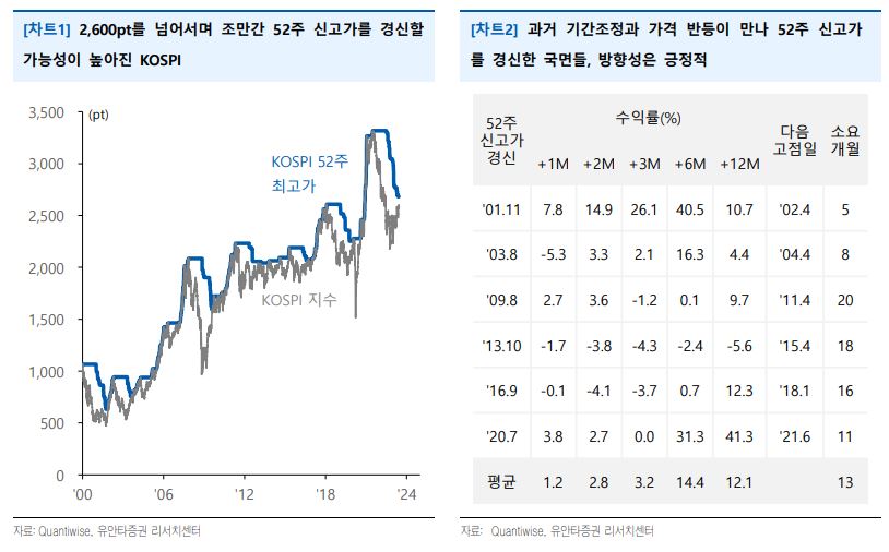 유안타증권이 코스피지수가 52주 신고가를 경신할 가능성이 크다고 전망했다.