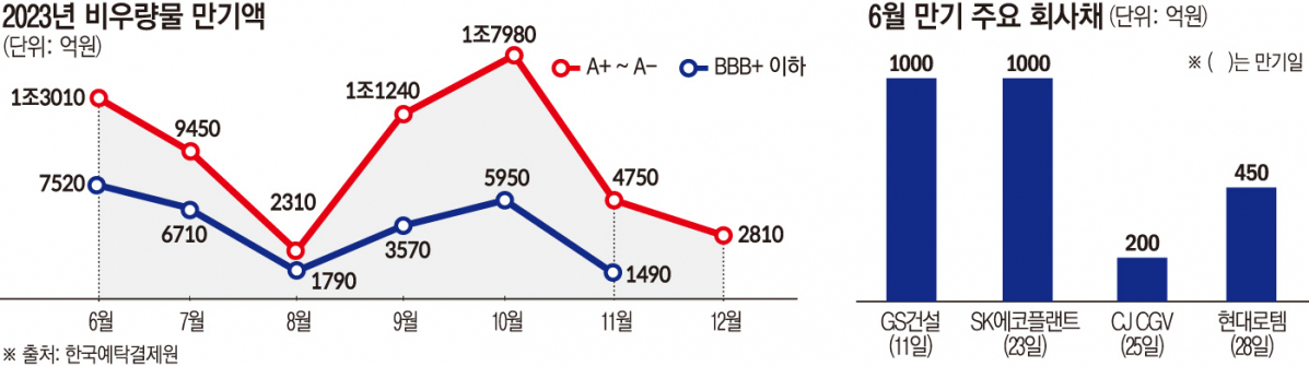 6일 금융투자업계에 따르면 6월부터 올해 말까지 만기가 도래하는 A등급 이하 비우량 회사채(무보증 선순위)는 8조8460억 원 규모다. 이 기간 비우량 회사채 만기액 규모가 8조 원을 넘어선 것은 최근 3년 내 처음이다. 월별로 보면 이달(2조530억 원)과 10월(2조3930억 원) 모두 2조 원이 넘게 차환에 나서야 한다. 6월까지 만기가 도래하는 BBB 이하 등급 회사채 규모는 7520억 원 수준으로 최근 3년 평균(약 2720억 원)을 훌쩍 뛰어넘는다.