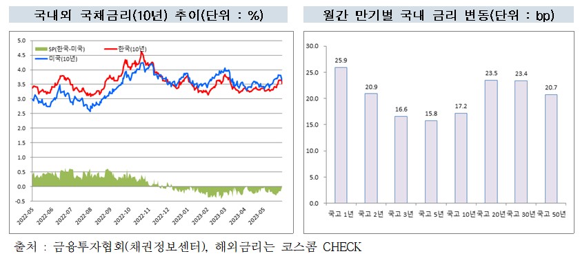 지난달 국내 채권 금리는 5월 한국은행 금융통화위원회 금리 동결에도 불구하고 상승 마감했다. 글로벌 금리 인상 가능성이 높아지는 등 긴축기조가 유지되면서다. 외국인 투자자들의 순매수 규모는 재정거래 유인이 확대된 영향으로 직전달보다 2배가량 증가했다.