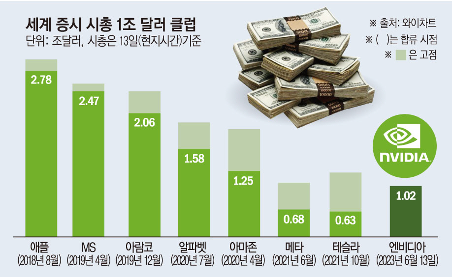 이에 엔비디아는 미국에서 시총 1조 달러를 넘어선 7번째 기업이 됐다. 앞서 애플, 마이크로소프트(MS), 구글 모회사 알파벳, 아마존, 페이스북 모회사 메타, 테슬라가 ‘시총 1조 달러 클럽’에 가입했다. 이 중에서도 지금까지 시총 1조 달러 이상을 유지하고 있는 기업은 애플, MS, 알파벳, 아마존 등 4개 기업뿐이다.