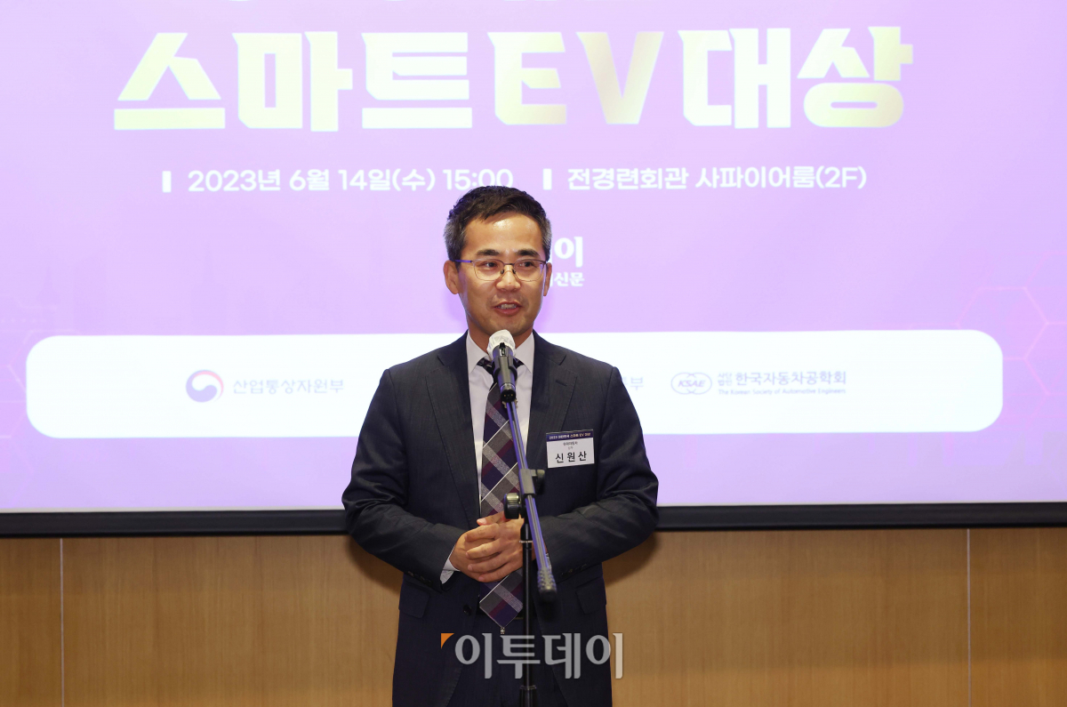 14일 서울 여의도 전경련회관 컨퍼런스센터에서 열린 ‘2023 대한민국 스마트EV대상’에서 종합대상을 수상한 신원산 현대차 상무가 소감을 밝히고 있다. 이투데이가 주최한 스마트EV대상은 자동차 산업의 새로운 패러다임으로 떠오른 전기차 시대를 맞아 순수 전기차를 대상으로 자동차 공학계의 대표 석학들이 공정한 평가를 통하여 경쟁력을 갖춘 전기차를 선정해 시상하는 자리다.