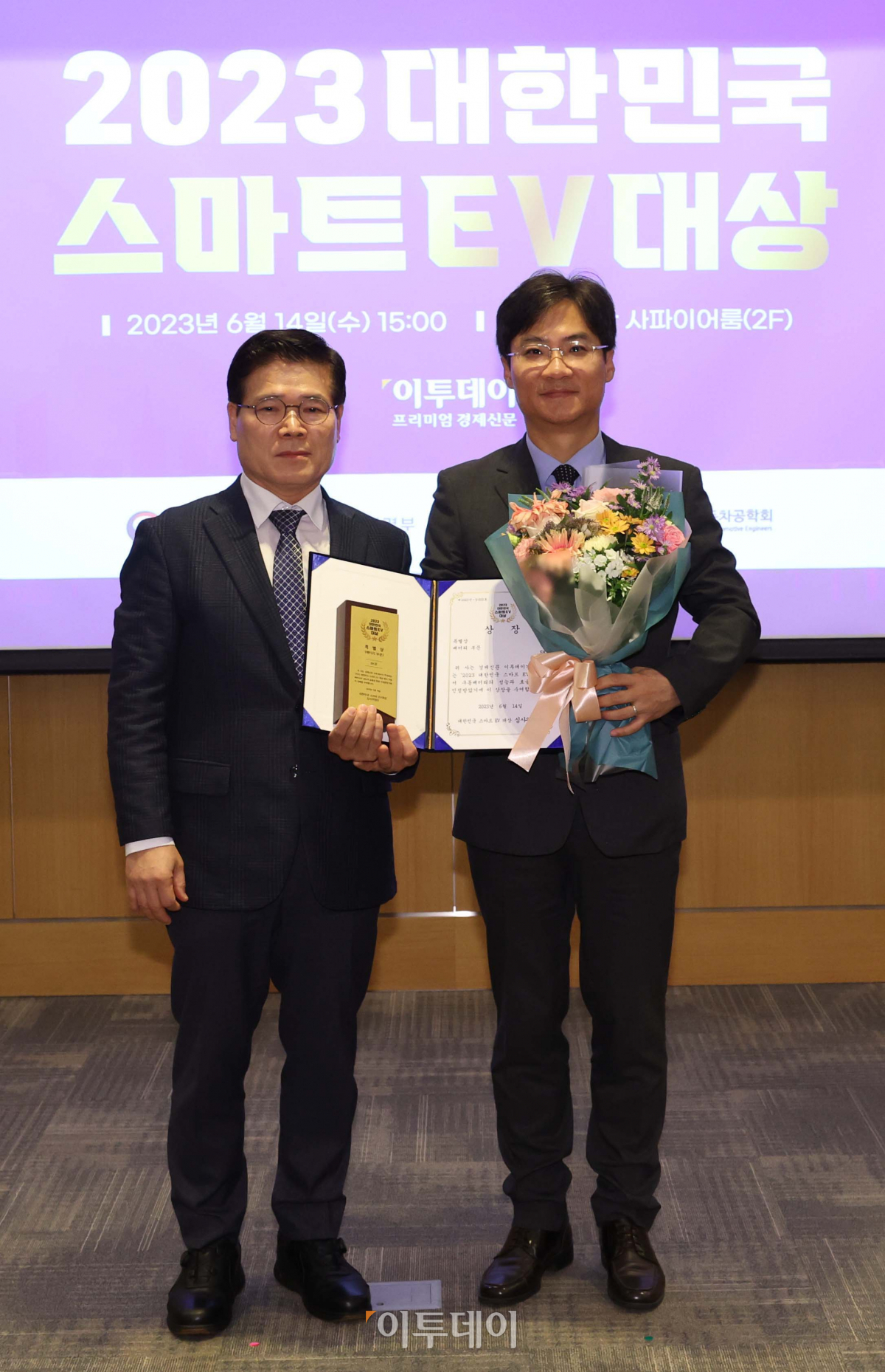 14일 서울 여의도 전경련회관 컨퍼런스센터에서 열린 ‘2023 대한민국 스마트EV대상’에서 배터리부문 특별상을 수상한 양성욱(오른쪽) SK온 PR담당 부사장과 시상자인 박용성 한국ESS산업진흥회 고문이 기념촬영을 하고 있다. 이투데이가 주최한 스마트EV대상은 자동차 산업의 새로운 패러다임으로 떠오른 전기차 시대를 맞아 순수 전기차를 대상으로 자동차 공학계의 대표 석학들이 공정한 평가를 통하여 경쟁력을 갖춘 전기차를 선정해 시상하는 자리다.