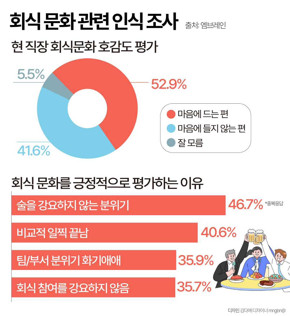 조사에 따르면 응답자 중 절반 이상인 52.9%가 현 직장의 회식 문화가 마음에 든다고 답했다.