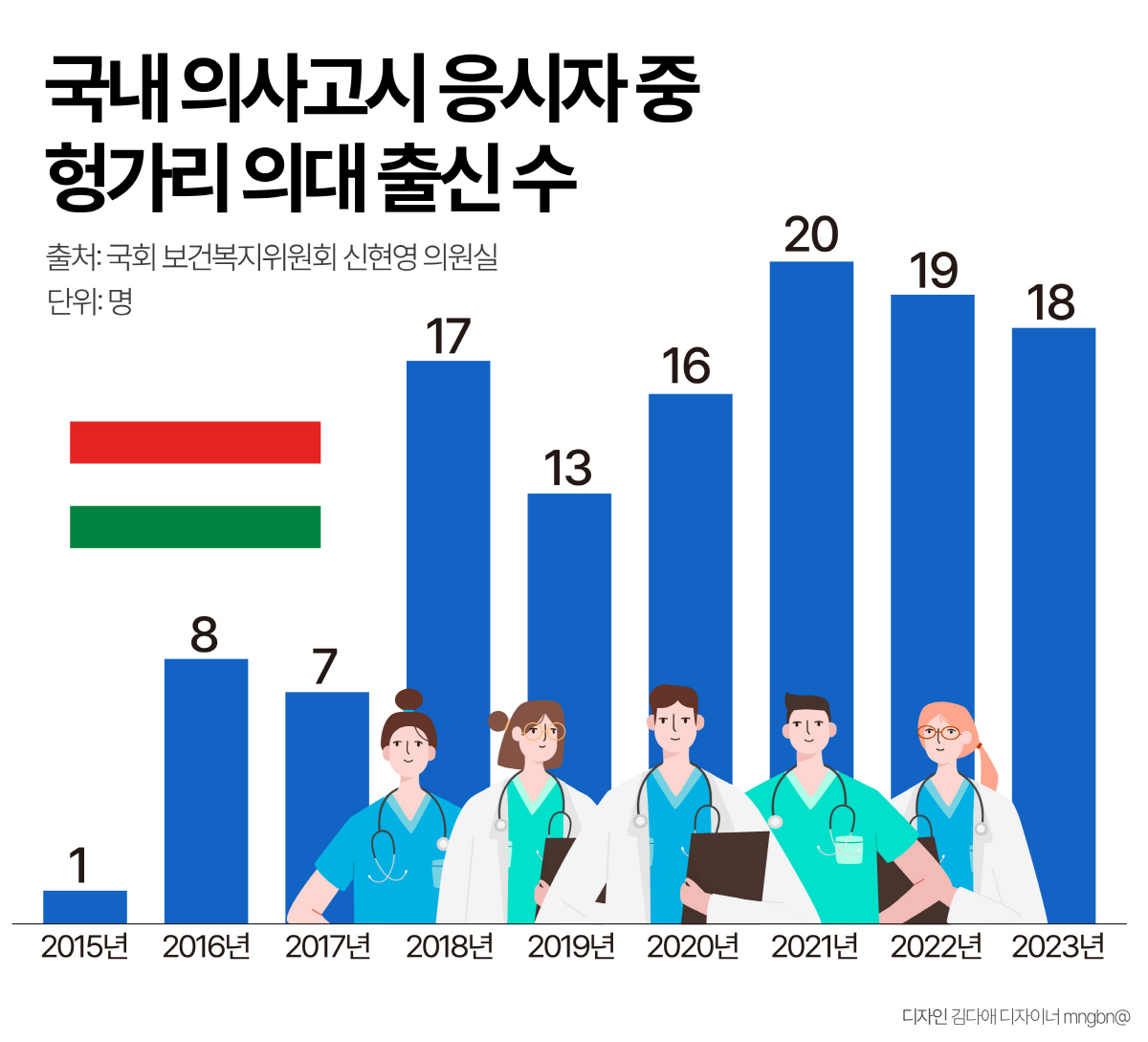 이처럼 헝가리 의대 출신의 국내 의사면허 취득 가능성이 높다 보니, 2015년 1명이었던 헝가리 의대 출신 응시자는 2016년 8명, 2017년 7명 등에 이어 2018년 17명, 2019년 13명, 2020년 16명, 2021년 20명, 2022년 19명, 2023년 18명 등 꾸준히 늘어나는 추세다.