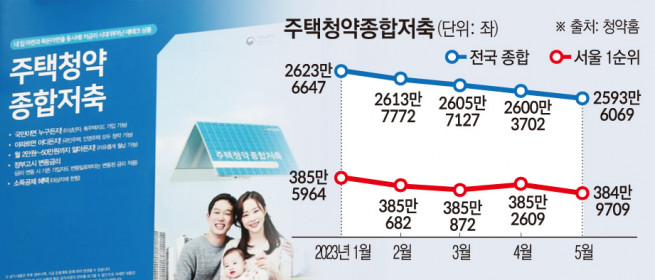 18일 한국부동산원 청약홈 통계를 분석한 결과, 지난달 말 기준 전국 주택청약종합저축(청약저축) 가입자 수는 2593만6069명으로 4월 2600만3702명보다 6만7633명(0.26%) 줄었다. 청약저축 가입자는 2021년 3월 2606만4515명을 기록해 2600만 명을 넘어선 이후 줄곧 2600만 명대를 유지했다. 하지만, 지난달 말 기준으로 2년 3개월 만에 2500만 명대로 쪼그라들었다.