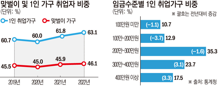 작년 하반기 고용 시장 훈풍에 맞벌이 가구 비중과 1인 취업 가구 비중이 역대 최대를 기록했다.