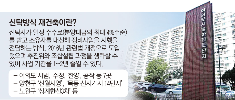 때문에 신탁 방식 재건축 사업은 정비업계에 대세로 자리 잡고 있다. 최근 서울 내 여의도와 목동, 상계동 등 주요 재건축 단지에서 신탁 방식 재건축 사업을 위한 사업시행자 선정 움직임이 곳곳에서 진행 중이다. 여의도는 전체 16곳 재건축 단지 중 7곳이 신탁 방식을 추진 중이고, 양천구 목동 14단지와 신월시영 등 대단지도 신탁사 선정에 가세했다.