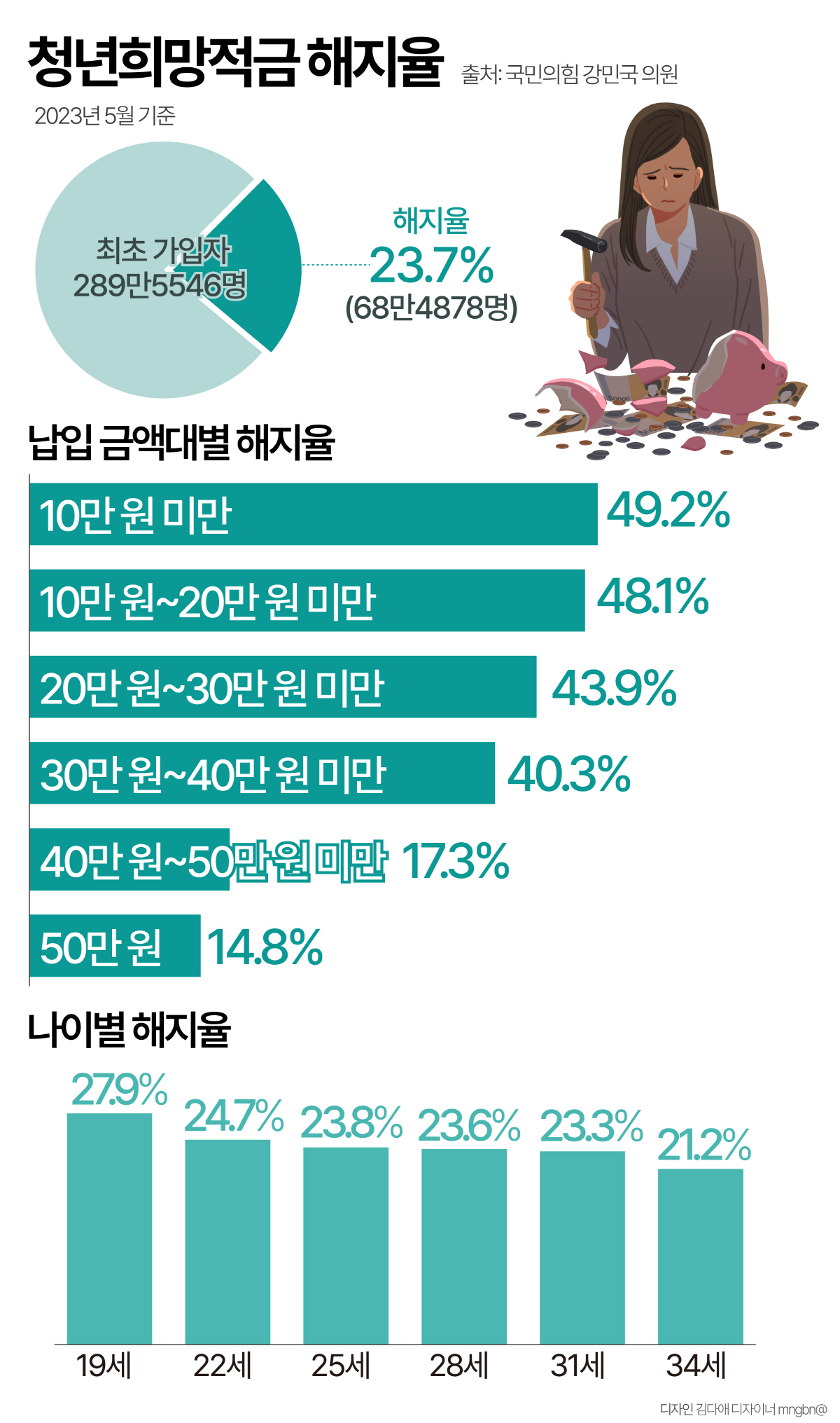 21일 금융감독원이 국민의힘 강민국 의원실에 제출한 ‘청년희망적금 운영 현황’에 따르면 지난해 2월 당시 최초 가입자는 289만5546명에 달했으나 지난 5월 말 기준 중도 해지자 수는 68만4878명으로 집계됐다