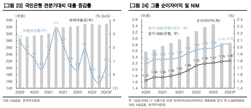 22일 백두산 한국투자증권 연구원은 “2분기 지배순이익은 1조2895억 원으로 컨센서스(시장 전망치)를 3% 하회할 전망”이라며 “주로 RC(Risk Component‧위험 요인) 값 조정에 따른 추가 충당금 적립에 따라 대손율 추정치가 상향된 영향”이라고 했다.
