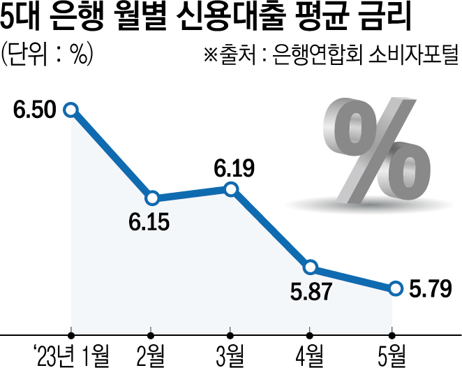 25일 은행연합회 소비자포털에 따르면 5대 시중은행에서 5월 취급한 신용대출 평균 금리는 연 5.79%다. 이는 전월(연 5.87%)보다 0.08%p 낮아진 것이다. 5대 은행의 신용대출 평균 금리는 두 달 연속 5%대를 기록하며 안정적인 흐름을 이어가고 있다.