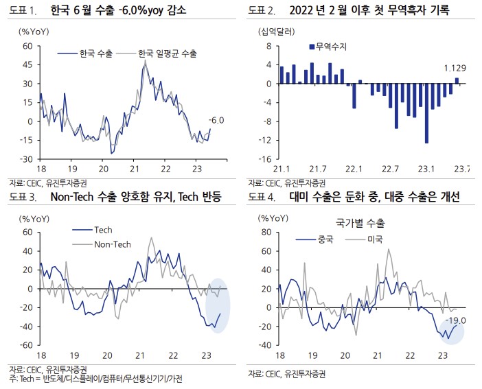 품목별로는 비 기술 제품 수출이 자동차(+58.3%)를 중심으로 양호하게 유지된 가운데 Tech 제품의 수출 부진이 완화되는 모습이 나타났다. 연초 -40%대의 감소세를 기록하던 반도체 수출은 6월 -28.0%로 감소 폭을 축소했다. 대중 수출도 올해 3월 -33.0%에서 6월 -19.0%로 낙폭을 조금씩 줄여나가고 있다.