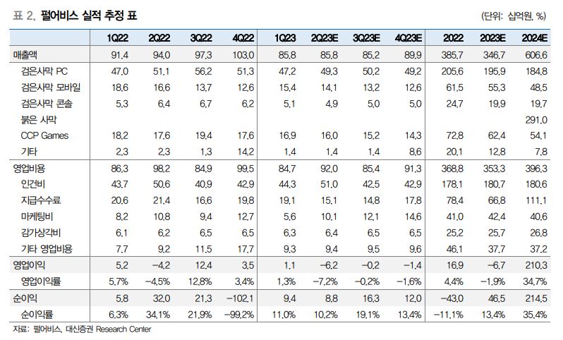 이 연구원은 “펄어비스의 올해 2분기 매출액은 858억 원, 영업손실은 –62억 원(적자지속)을 예상한다”며 “매출, 영업이익 모두 컨센서스(시장 전망치)를 하회할 전망”이라고 봤다.