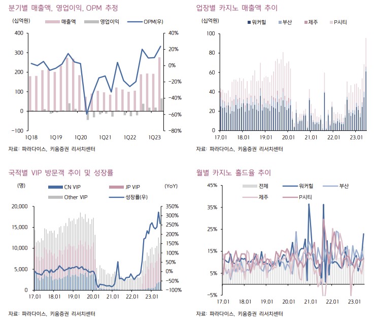 이남수 키움증권 연구원은 파라다이스의 2분기 매출액을 2761억, 영업이익 656억 원으로 전망치를 웃돌 것으로 전망했다. 전년 대비 각각 162%, 23.8% 증가한 수치다. 이 연구원은 "2분기 월별 카지노 순매출액은 각각 539억 원, 685억 원, 956억 원으로 2019년 월평균 653억 원에 근접했다. 워커힐 지점의 성장이 실적 개선을 주도한 것으로 판단한다"고 했다.