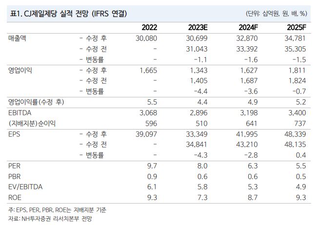 NH투자증권이 CJ제일제당에 대해 실적 측면에서의 바닥이 확인되고 있다고 분석했다. 투자의견은 ‘매수’ 유지, 목표주가는 기존 46만 원에서 40만 원으로 하향조정했다. 전 거래일 기준 종가는 26만6500원이다.