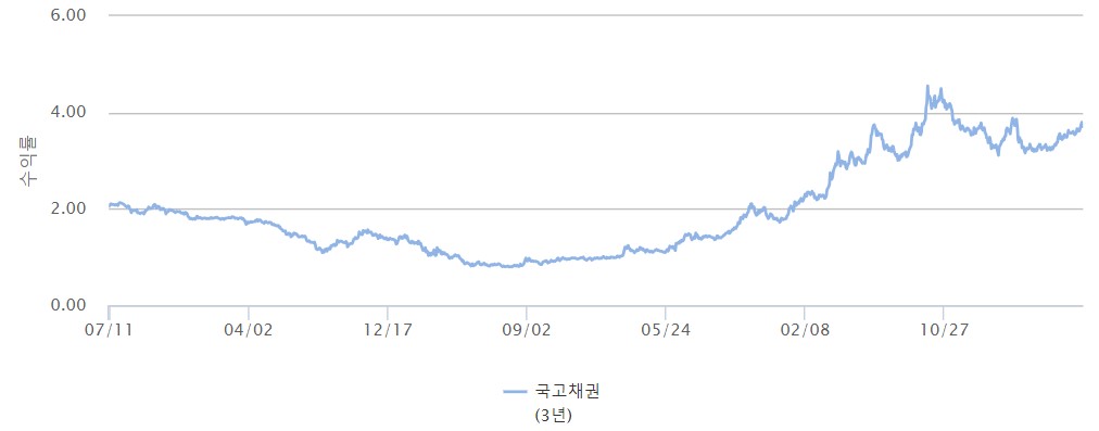 11일 서울 채권시장에서 국고채 금리는 전 구간 하락 마감했다. 국고채 3년물은 전 거래일보다 0.092%P 하락한 연 3.703%에 거래를 마쳤다.