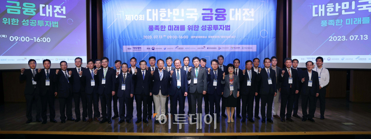 김주현 금융위원회 위원장, 유일호 전 부총리 겸 기획재정부 장관, 김광수 은행연합회 회장, 손병두 한국거래소 이사장, 서유석 금융투자협회 회장, 정지원 손해보험협회 회장, 김덕헌 이투데이 대표이사 등 내빈들이 13일 서울 중구 대한상공회의소에서 열린 ‘제10회 대한민국 금융대전’에서 기념촬영을 하고 있다. 이투데이가 ‘풍족한 미래를 위한 성공투자법’을 주제로 개최한 대한민국 금융대전은 재테크에 관심있는 일반인들을 대상으로 금융 지식과 전략적인 투자 방법을 제공하여 개인의 재무 관리 역량을 향상시키고, 미래를 더욱 안정적으로 대비할 수 있는 기회를 제공하는 자리다.