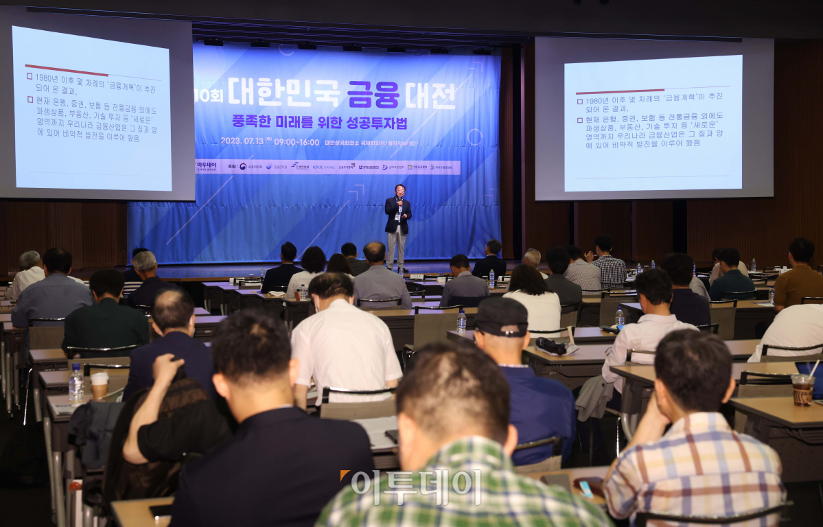 유일호 전 부총리 겸 기획재정부 장관이 13일 서울 중구 대한상공회의소에서 열린 ‘제10회 대한민국 금융대전’에서 ‘금융과 금융정책’을 주제로 기조강연을 하고 있다. 이투데이가 ‘풍족한 미래를 위한 성공투자법’을 주제로 개최한 대한민국 금융대전은 재테크에 관심있는 일반인들을 대상으로 금융 지식과 전략적인 투자 방법을 제공하여 개인의 재무 관리 역량을 향상시키고, 미래를 더욱 안정적으로 대비할 수 있는 기회를 제공하는 자리다.