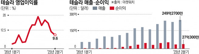 주요 모델의 차량 가격 인하로 마진은 악화했다. 영업이익률은 9.6%를 기록해 한 자릿수대로 떨어졌으며 전년 동기의 14.6% 대비 5%포인트(p) 하락했다. 다만 WSJ는 “일각에서 우려했던 만큼 연이은 가격 인하가 실적에 큰 타격을 주진 않았다”고 평가했다.