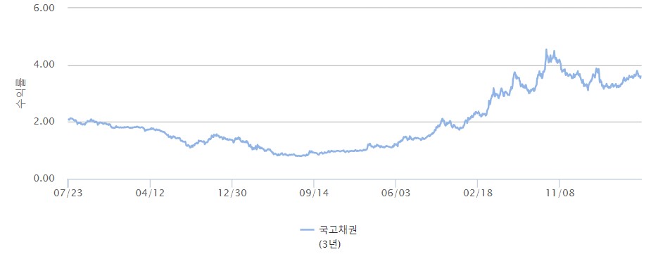 국고채 3년물은 전 거래일보다 0.021%P 상승한 연 3.602%에 거래를 마쳤다.