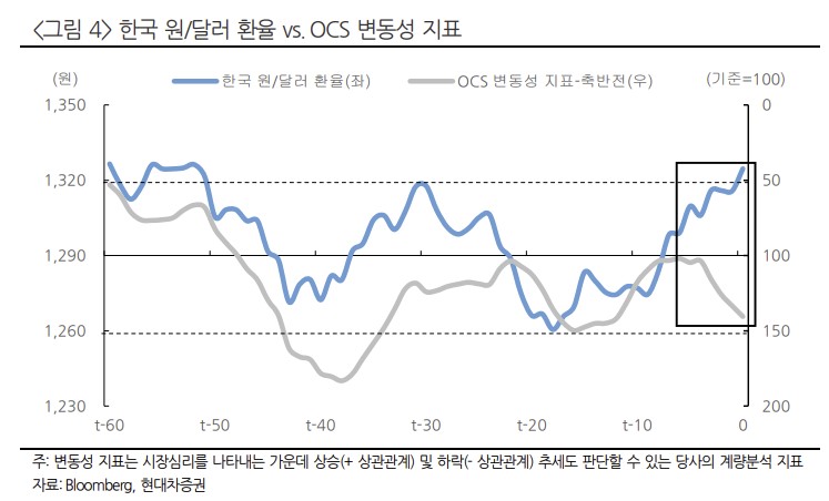 무엇보다 변동성 지표에서 원·달러 환율의 상승추세 전환 신호가 발생했다. 변동성 지표는 최근 금융시장 변동성이 과거 통상적인 변동성 대비 어떠한지를 나타내는 지표로 투자심리에 따른 추세 및 조정 여부를 판단한다.