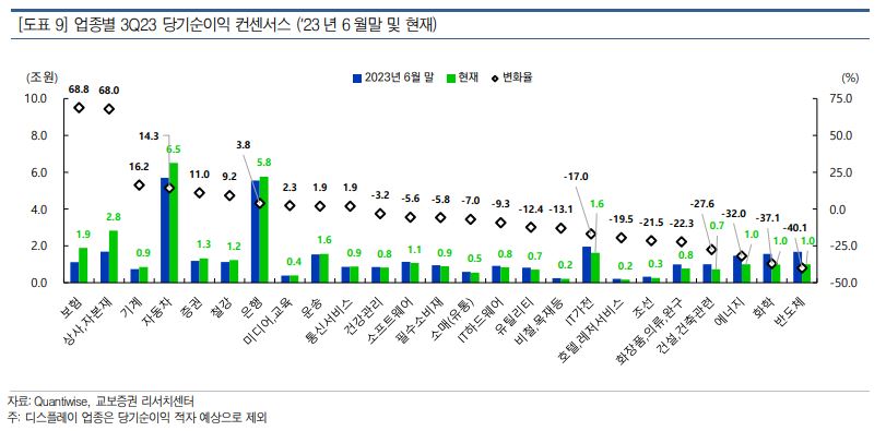 강 연구원은 “전년 대비 이익 감소의 대부분은 반도체(삼성전자‧SK하이닉스), 에너지(SK이노베이션‧S-Oil‧ HD현대‧GS), 운송(HMM‧현대글로비스) 업종의 실적 부진에 기인한다”며 “유틸리티 업종은 아직 적자를 유지하고 있지만, 전년 대비 적자 폭 개선됐다”고 했다.