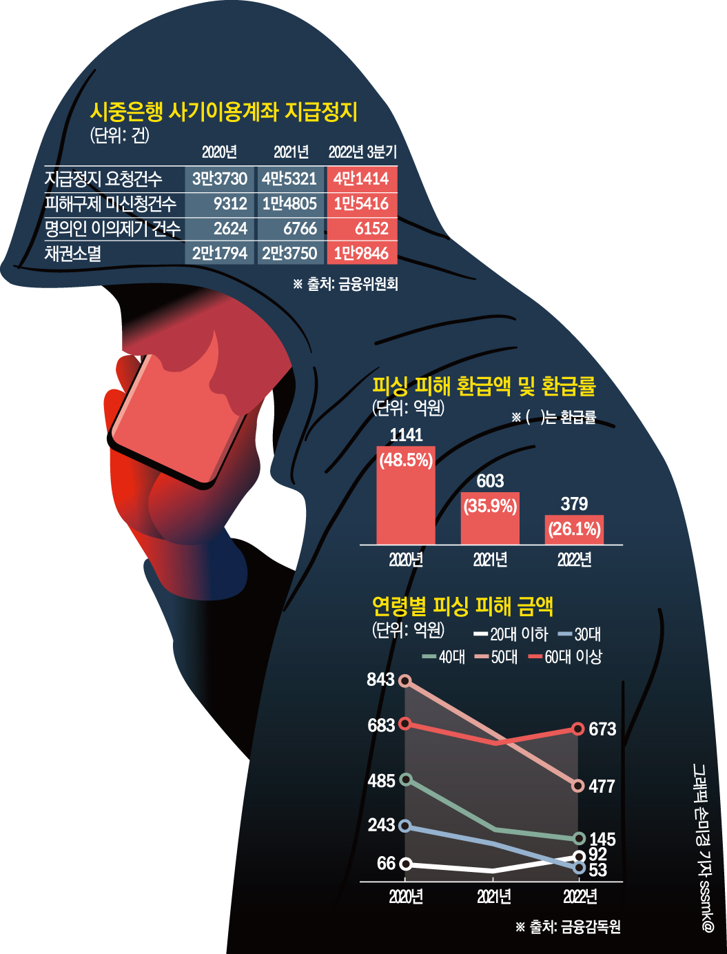 20일 금융위원회에 따르면 시중은행 사기이용계좌 지급정지 요청건수는 2020년 3만3730건에서 2021년 4만5321건으로 1년 새 34% 증가했다. 이중 채권소멸이 정상적으로 진행된 경우는 같은 기간 2만1794건에서 2만3750건으로 9% 증가했다.
