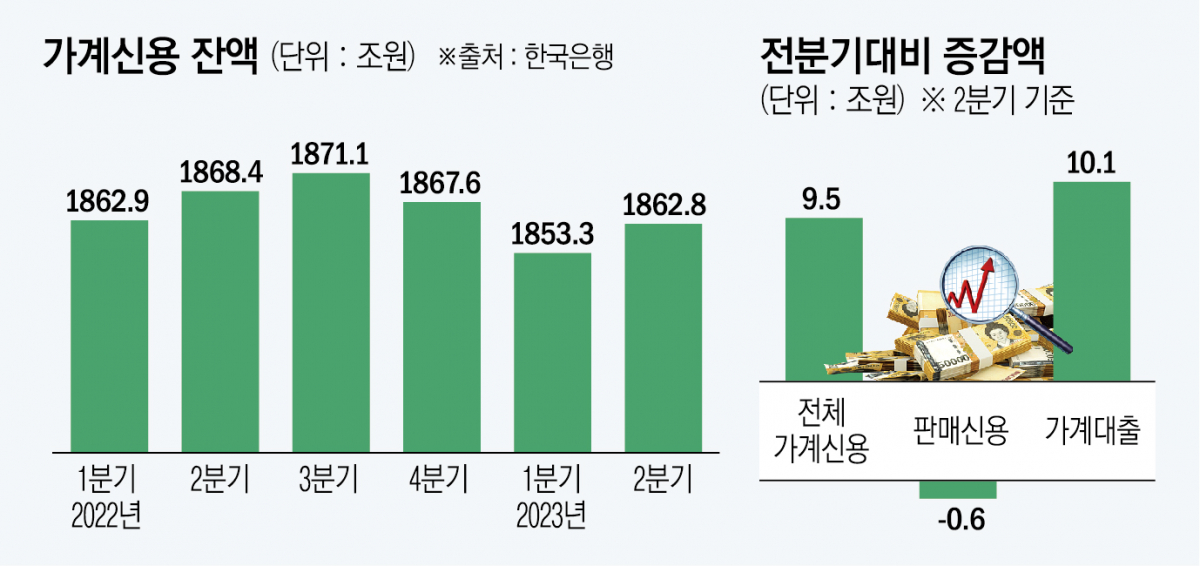 한국은행이 22일 발표한 ‘2분기 가계신용(잠정)’에 따르면 2분기 말 가계신용 잔액은 1862조8000억 원으로 올해 1분기 말과 비교해 9조5000억 원 늘었다. 3분기 만에 증가로 전환했으며, 2021년 4분기(+17조4000억 원) 이후 증가폭이 가장 컸다.