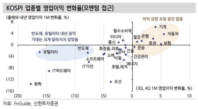 그는 "전체적으로 코스피 이익 모멘텀이 당장 살아나기 어려운 국면이다. 영업이익 변화율 하락에 따라 코스피 수익률도 동조화 양상을 보이고 있다"며 "반도체는 업황 반등 시점 지연 가능성도 염두에 둬야 한다"고 했다.