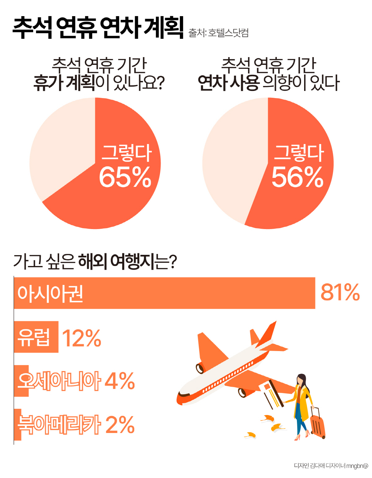 호텔스닷컴에 따르면 7월 26일부터 8월 1일까지 최근 3년 동안 1회 이상의 국내외 여행을 간 적이 있는 만 25∼65세 한국인 직장인 1000명을 대상으로 설문 조사결과 65%가 ‘이번 추석 기간 여행을 계획하고 있다’라고 답했다.