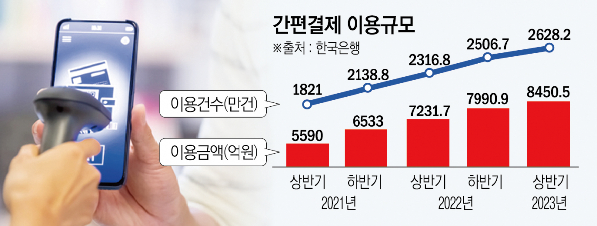 6일 한국은행이 발표한 '2023년 상반기 중 전자지급서비스 이용 현황'에 따르면 삼성페이, 네이버페이, 카카오페이 등 스마트폰에 저장한 생체정보 등을 이용한 간편결제 서비스의 하루평균 이용 금액은 8451억 원으로 집계됐다. 지난해 같은 기간보다 16.9% 증가한 규모다. 이용 건수도 하루평균 2628만 건으로, 같은 기간 13.4% 늘었다.