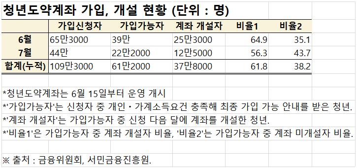 가입 가능 청년 중 계좌를 개설하지 않은 이들의 비율이 7월보다 8월에 늘었다. 6월 신청자 65만3000명에서 가입 가능 안내를 받은 약 39만 명의 청년 중 7월에 실제로 계좌를 만든 청년은 25만3000명으로, 64.9%였다. 7월에는 약 35.1%가 소득요건을 충족했음에도 계좌는 개설하지 않았다.