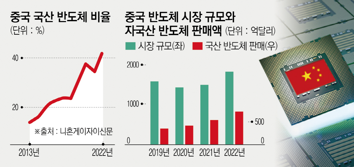 지난해 중국 반도체 시장 규모는 시황 악화로 전년 대비 5% 감소했지만, 자국산 반도체 판매액은 14% 증가했다. 작년 중국시장에서 차지하는 자국산 반도체 비율은 40%를 넘어섰다. 중국 최고의 반도체 전문가인 웨이샤오쥔 칭화대 반도체학과 교수는 “미국의 대중국 규제 강화가 꼭 나쁜 것만은 아니다”라며 “중국 반도체 산업 성장의 계기가 되고 있다”고 말했다.