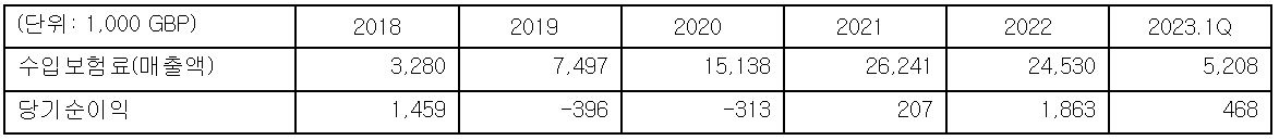 코리안리는 런던에 법인과 사무소의 형태로 두 개의 점포를 운영하고 있다. 법인은 로이즈의 일부 신디케이트에 투자하는 사업을 영위함으로써 매출과 수익을 발생시키고 있고, 사무소는 해외수재 영업지원 활동 및 현지 시장조사 활동 기능을 담당하고 있다.