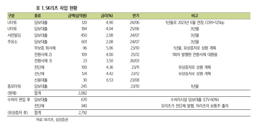 이 연구원은 “3000억 원의 유상증자와 수처리시설 편입을 모두 고려하면 SK리츠의 차입금은 2조7000억 원”이라며 “기존 대비 6000억 원 증가하고 공정가액 기준 주택담보인정비율(LTV)은 65%로 현재 대비 4%포인트(p) 하락했다”고 했다.
