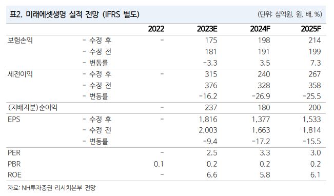 정 연구원은 “IFRS17 체제 진입으로 생‧손보 업계가 적극적인 신계약 영업을 통해 계약서비스마진(CSM)을 확보하고 있지만, 미래에셋생명은 다소 미진하다”며 “올해 상반기 미래에셋생명 연납화보험료(APE)는 1206억 원에 불과한 상황”이라고 했다.