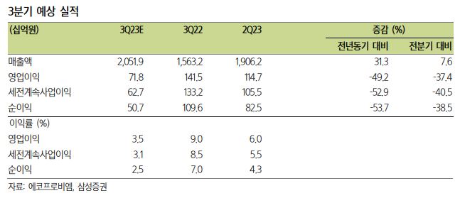 장 연구원은 “판가는 2분기 대비 원‧달러 환율이 우호적이었으나, 전 분기 대비 두 자리 중반대 % 수준으로 떨어진 것으로 추정된다”며 “출하도 삼성SDI향 전동공구 부진과 SK온 통한 유럽 고객사 물량 둔화 영향 등을 고루 받으면서 2분기 대비 감익 폭이 당초 100억 원대에서 300억 원대 이상으로 커질 수밖에 없었을 것”이라고 했다.