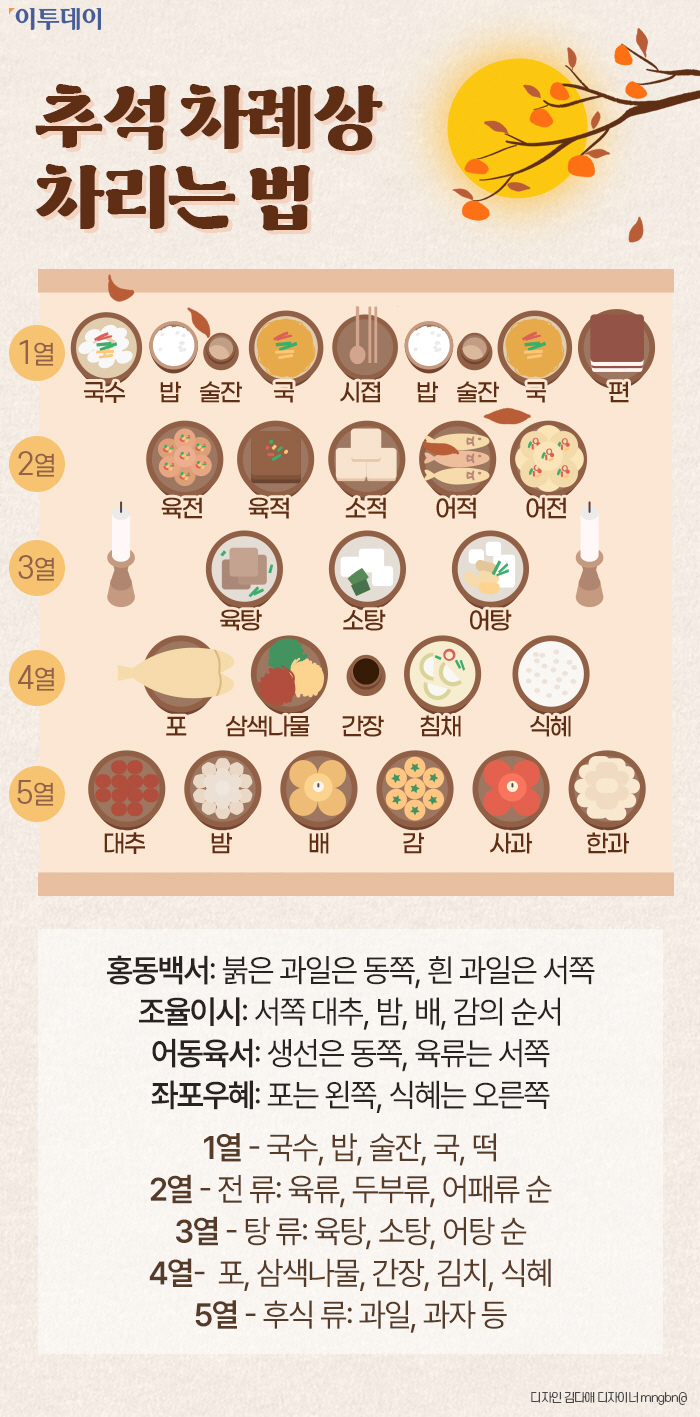 하지만 차례상의 일반적인 상차림은 5열로 구성된다. 신위가 있는 쪽을 1열로 보면, 1열은 식사류인 밥, 국 등을 배치한다. 2열은 제사상의 주요리가 되는 구이, 전 등이 오르고, 3열에는 그다음 부요리인 생선, 두부, 고기탕 등 탕류를 놓는다. 4열에는 나물, 김치, 포 등 밑반찬 류, 5열에는 과일과 과자 등 후식에 해당하는 음식이 올라온다.