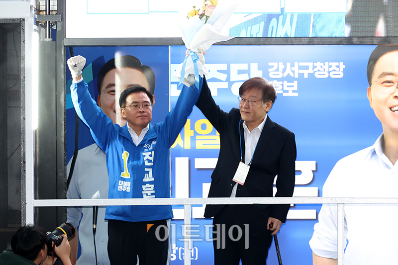 이재명 더불어민주당 대표가 9일 서울 강서구 발산역 인근 공원에서 진교훈 강서구청장 후보자 지원유세를 하고 있다. 고이란 기자 photoeran@