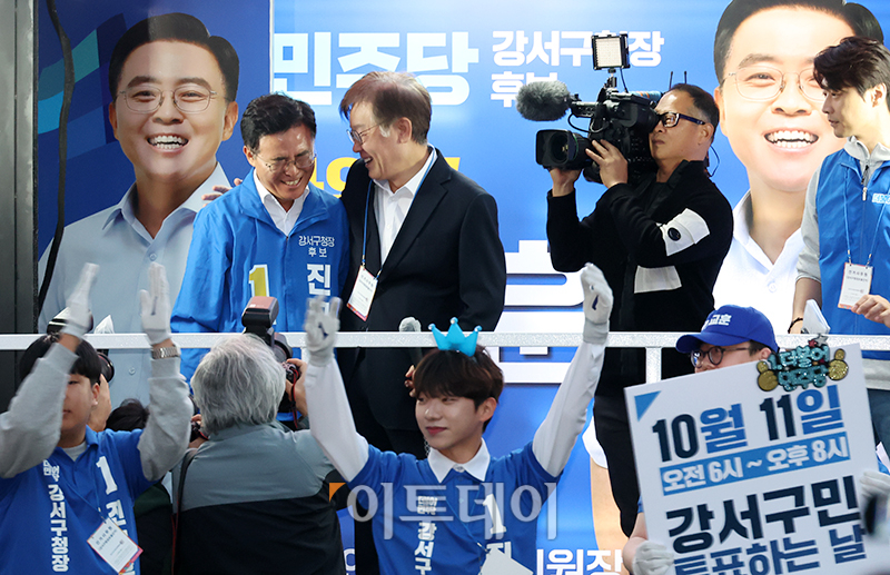 이재명 더불어민주당 대표가 9일 서울 강서구 발산역 인근 공원에서 진교훈 강서구청장 후보자 지원유세를 하고 있다. 고이란 기자 photoeran@