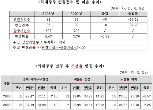 전체 최대주주 변경법인의 최대주주 지분율은 2009년의 경우 변경전 27.39%에서 변경후 28.99%로 1.60%p 증가했다. 그러나 동일 건에 대해 2008년 2.65%p 증가한 것으로 나타나 증가폭은 둔화됐다.