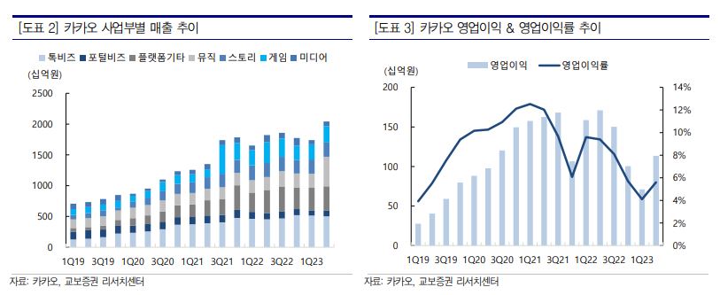 김 연구원은 “자회사와 투자자산 지분가치 조정에 따라 목표주가를 하향한다”며 “프로필 탭 과 오픈채팅 탭을 비롯한 카카오톡 개편에 따른 톡비즈 매출 반등은 점진적으로 나타날 것으로 전망하며, 올해 하반기 게임 부문의 성장 역시 저조할 것”이라고 했다.