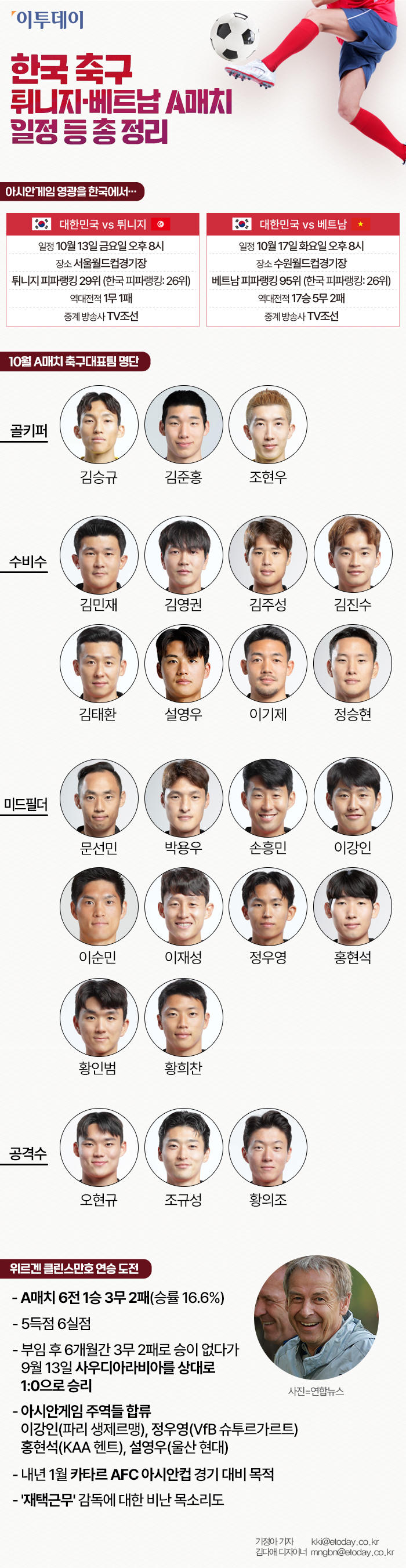 [인포그래픽] 한국 축구, 튀니지·베트남 A매치 일정 등 총 정리