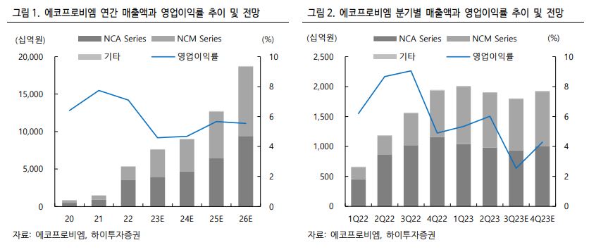 16일 정원석 하이투자증권 연구원은 “에코프로비엠의 3분기 잠정 실적은 매출액 1조8000억 원, 영업이익 459억 원, 영업이익률 2.5%”라며 “하이투자증권 전망치(매출액 2조 원, 영업이익 540억 원, 영업이익률 2.7%)를 다소 하회했다”고 했다.