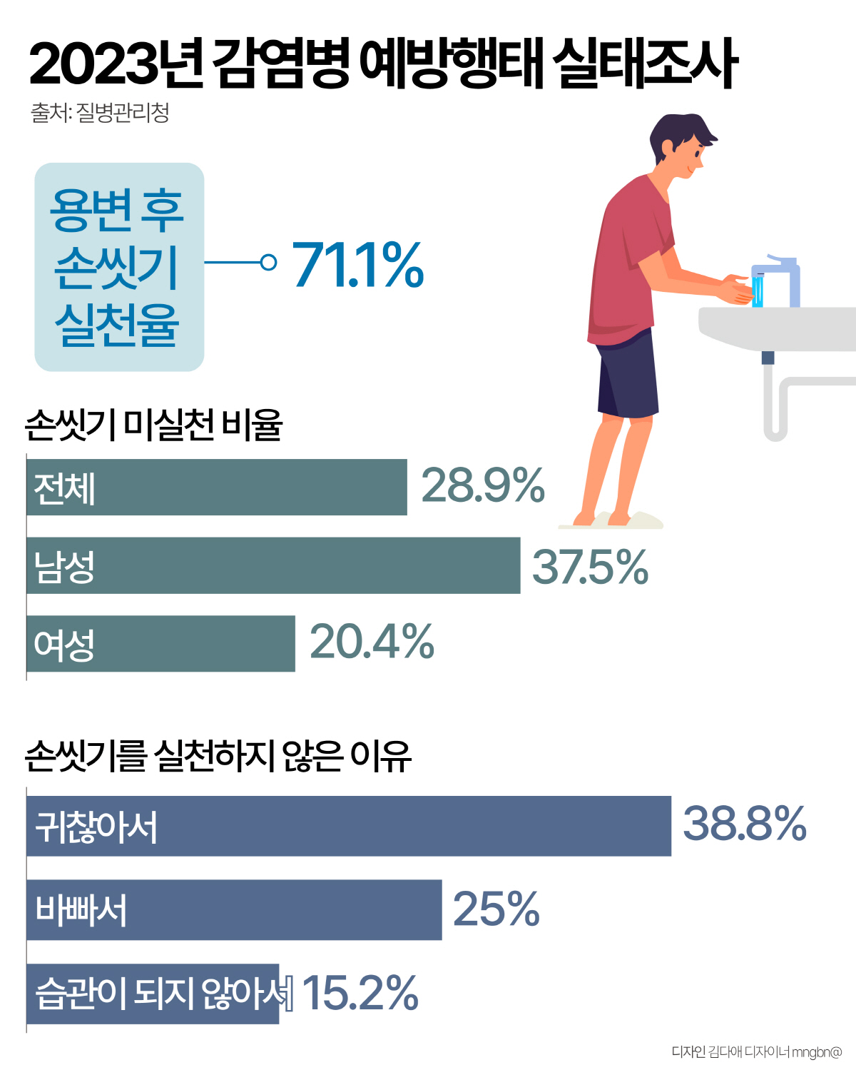 질병관리청이 국제한인간호재단과 함께 지난 8월 14일~9월 13일 성인 4795명을 대상으로 손 씻기 실태를 조사한 결과, 용변을 본 뒤 손을 씻은 비율은 71.1%였다.